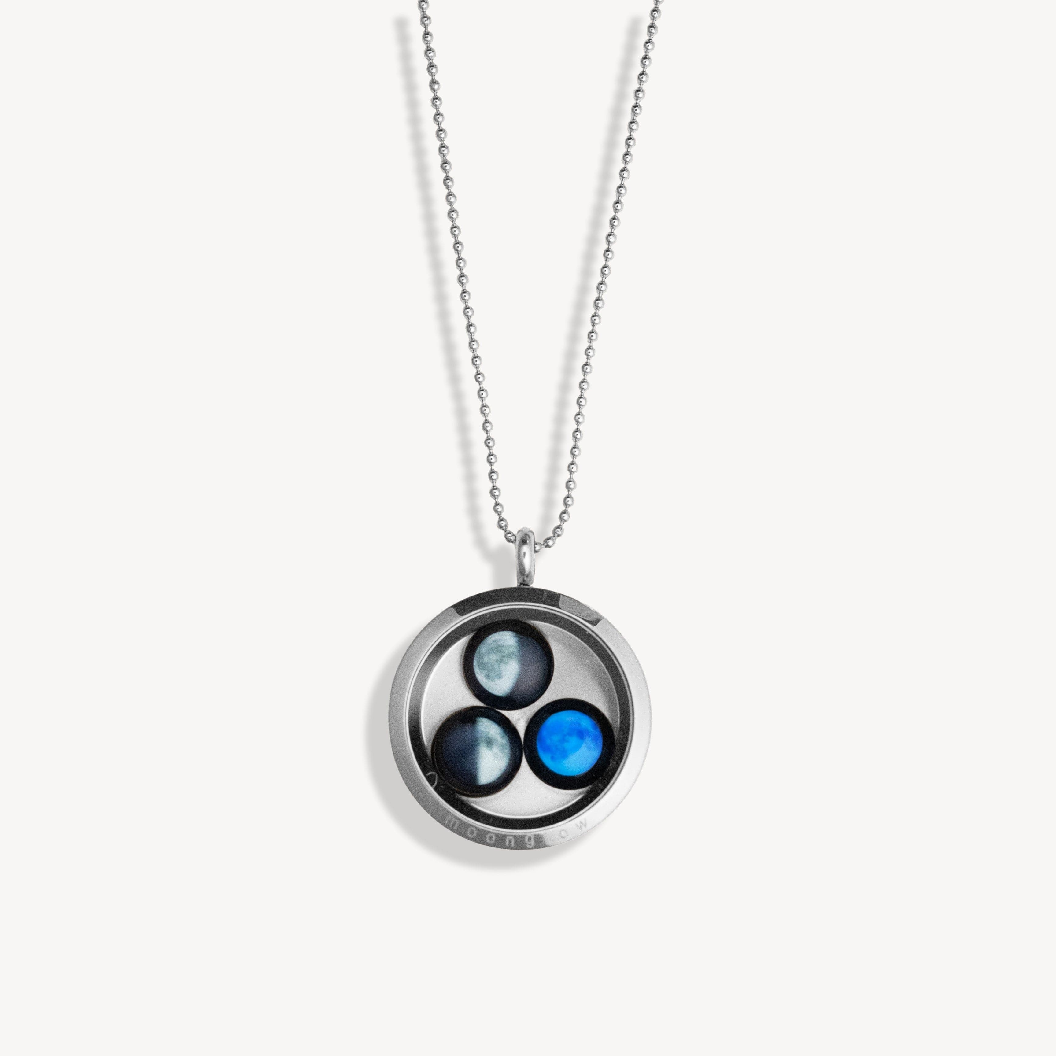 Moonglow’s Family Locket is composed of a stainless steel chain, a glass-centered locket, and three charms with mini moon phase images. Each charm is aligned with the moon phase of your sacred date, and glows at night, illuminating your journey forward. Select three special dates and keep your cherished moon phases close to your heart.