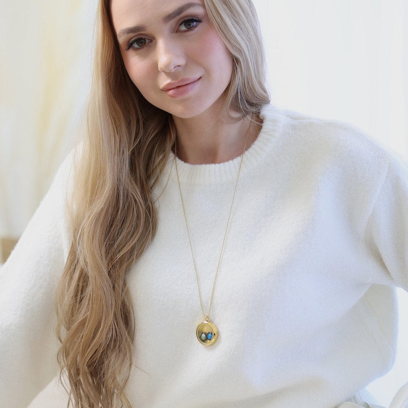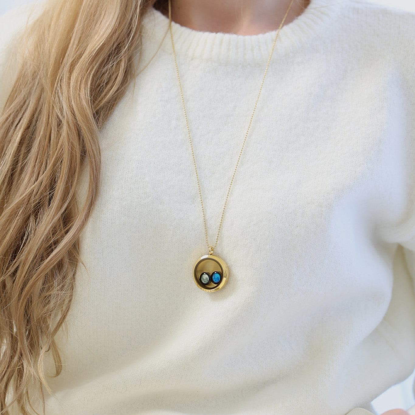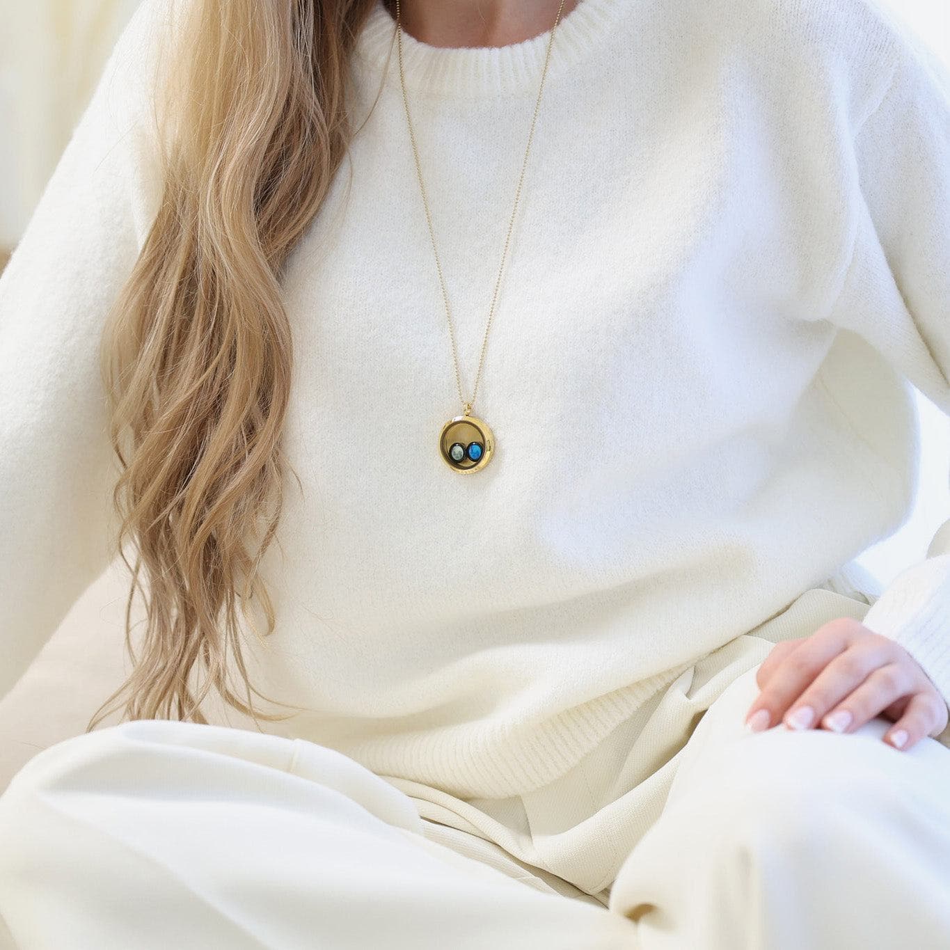 You can wear the Lovers In The Locket Necklace around your neck or hang it on your mirror to remind yourself of your loved one every day. Style it alone, or mix and match it with other necklaces from our collection. We also love to see it paired with the Astral Dyad Cuff in Gold and the Carina Hoops in Gold.