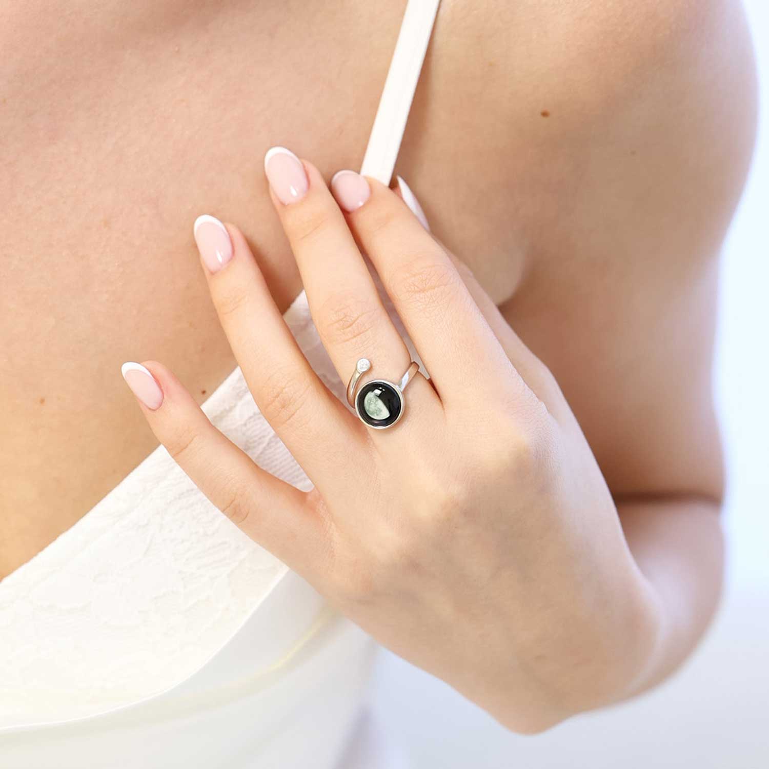 Nous avons revisité une bague spirale réglable classique en rhodium et lui avons donné une touche d'éclat cosmique en y ajoutant un cristal et une image de lune de 10 mm. L'image de la lune est délicatement reproduite, ajoutant une touche de rêve à n'importe quelle tenue.