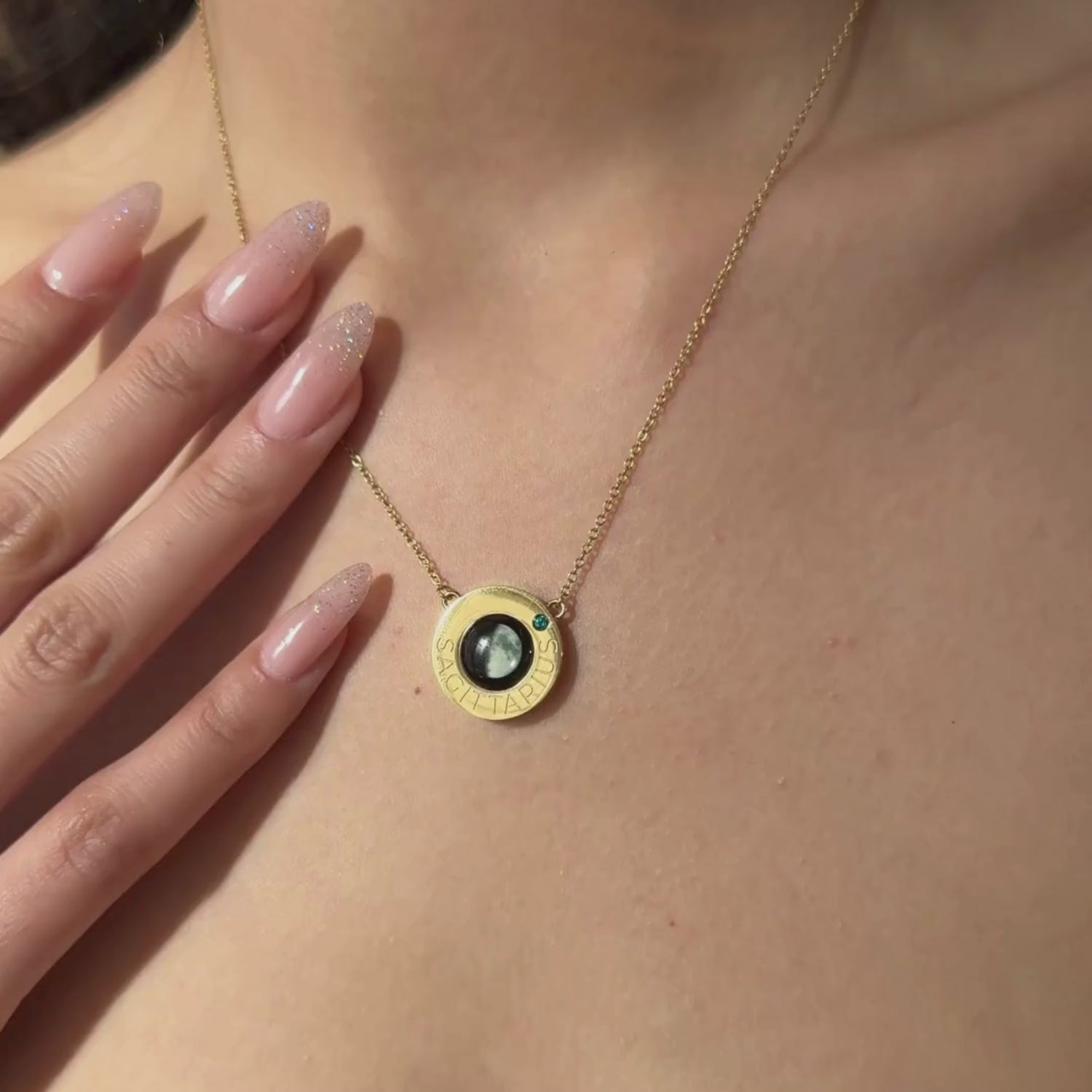 The Sagittarius Lunar Soulkeeper Necklace is a celestial treasure crafted to honor your unique place in the universe. Featuring the moon phase from a date meaningful to you, your zodiac sign artfully inscribed, and a delicate birthstone, this necklace brings together the energies that shape your soul. Each element is chosen with intention, creating a personal talisman that connects you to the night sky and the cosmic forces that guide your journey. Wear the Lunar Soulkeeper as a reminder of your inner light and the timeless bond you share with the universe.